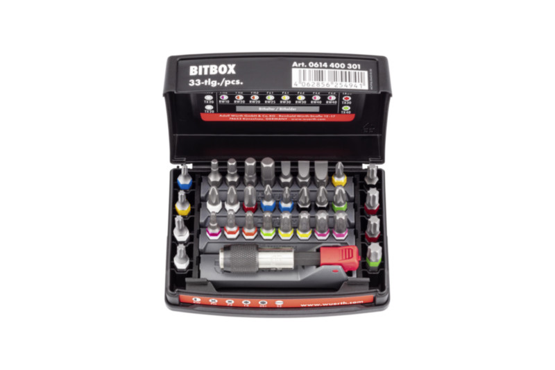 Obsežen komplet z RW-, PH-, PZ-, TX-, notranjim šesterokotnikom in ravnim pogonom v zamenljivih vrsticah nastavkov, vključno z držalom za nastavke. Na voljo v ORSY® sistemski bitbox škatli.