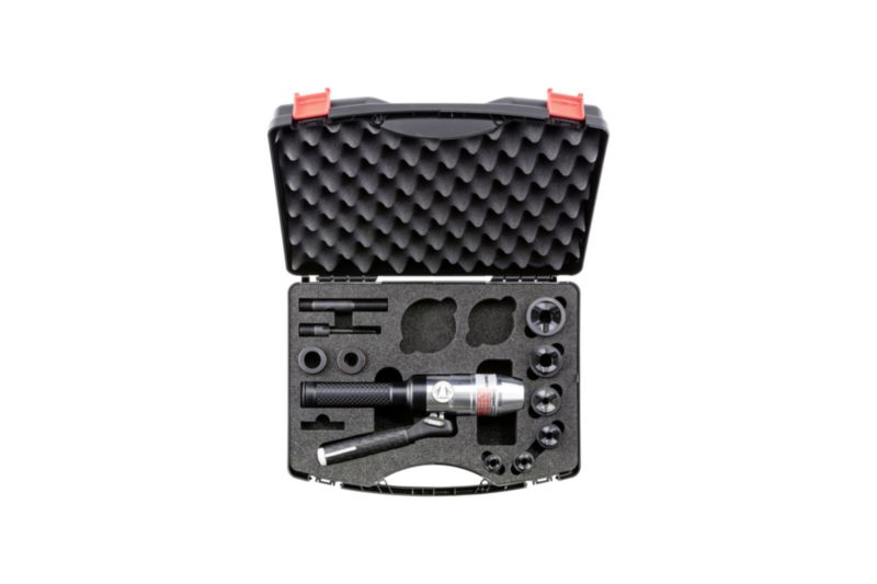 Sestavljen iz ročnega hidravličnega luknjača, žiga in matric M16, M20, M25, M32, M40 in 30,5, nateznega vijaka dia. 9,5 in 19,0 ter komplet distančnih puš.