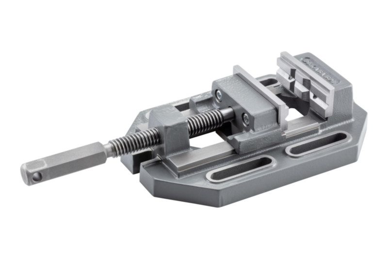 Ojačan strojni primež iz litega železa z dvema zamaknjenima V-blokoma in visokokakovostnim vodilom.
