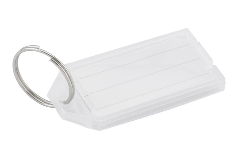 Obesek za ključe z jeklenim obročem in papirnatim vložkom.