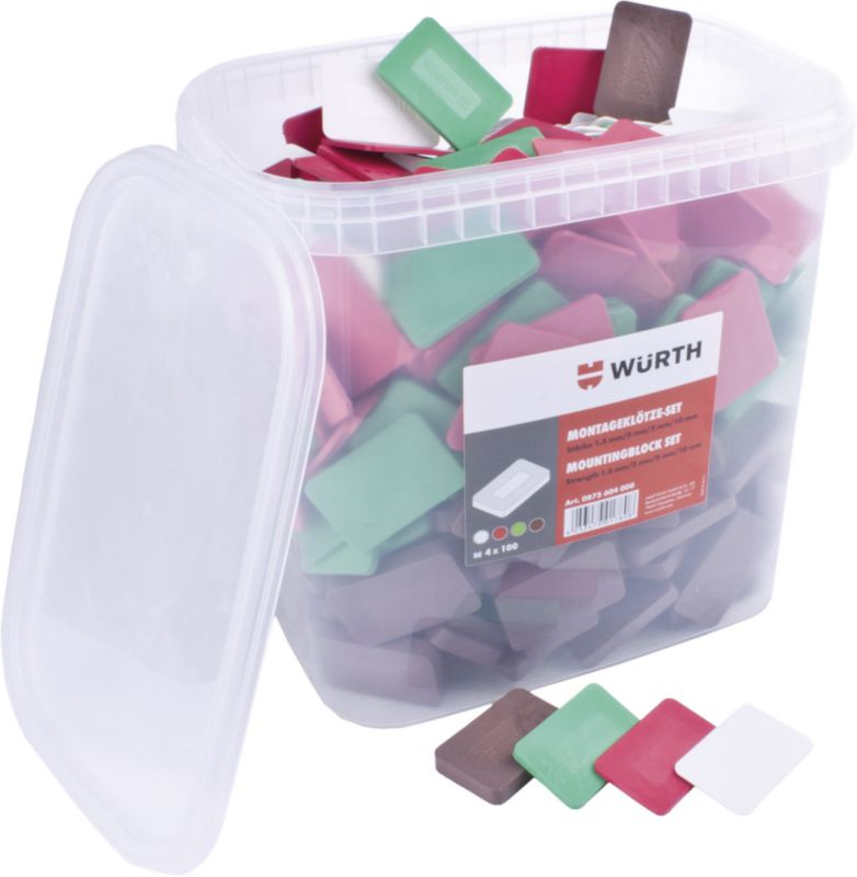 Univerzalno uporabni montažni pomočniki za poravnavo, izravnavo ali podlaganje kot praktični komplet. Še posebej primerno za strokovno prenašanje obremenitev pri montaži oken