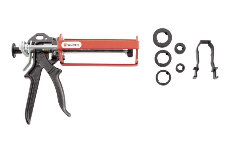 Kartušna pištola za 2K lepila s hitro zamenljivimi plastičnimi tlačnimi ploščami za mešalna razmerja 1:1, 2:1, 4:1 in 10:1.