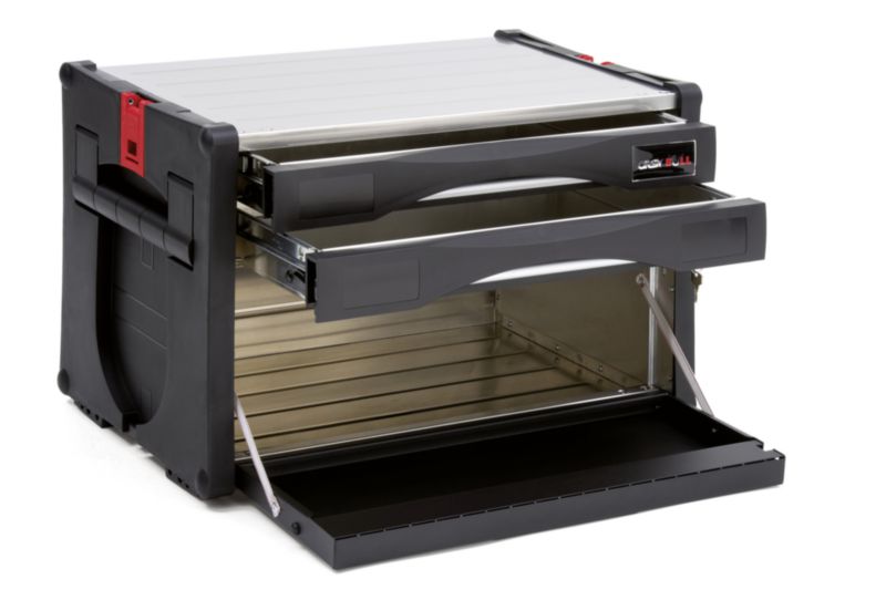 Prevozni in orodni zaboj za večjo urejenost in preglednost, ki združuje prednji nakladalnik in predale.
