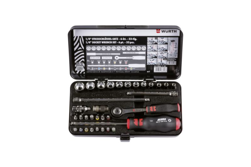 - Sklop 1/4 palca vključuje 12 vtičnic s širino po ploskvi od 4 do 14 mm in adapter s hitrovpenjalnim vpenjalom za 15 bitov
