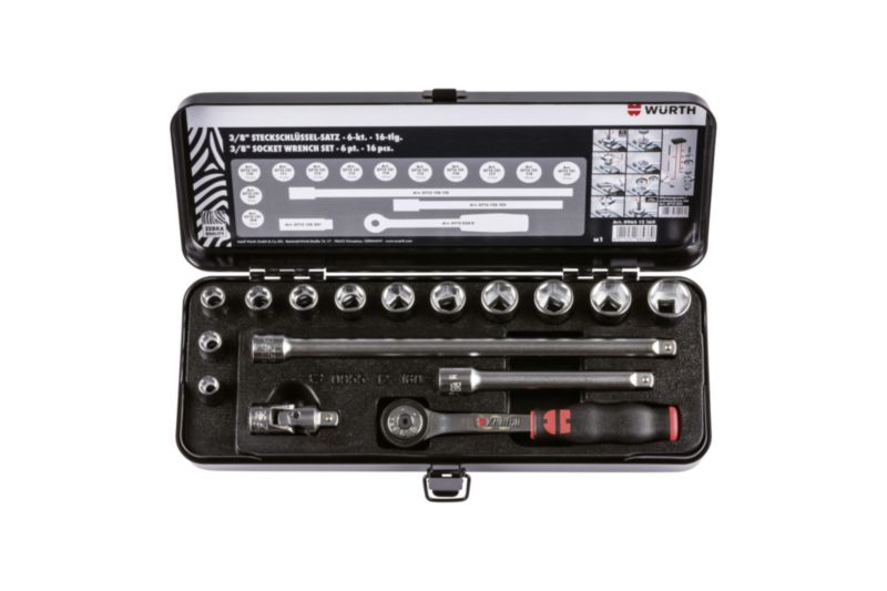- 3/8-palčni asortiman vključuje 12 vtičnic s širino po ploskvah od 8 do 19 mm