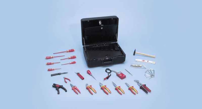Popolnoma založen kovček za električarje s standardno opremo, vključno z 2 m zložljivim pravilom.