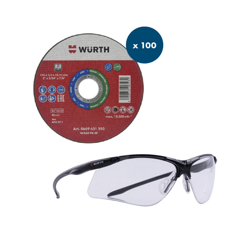 Set vsebuje rezalne plošče za natančno in zanesljivo rezanje kovin ter zaščitna očala za varno delo.