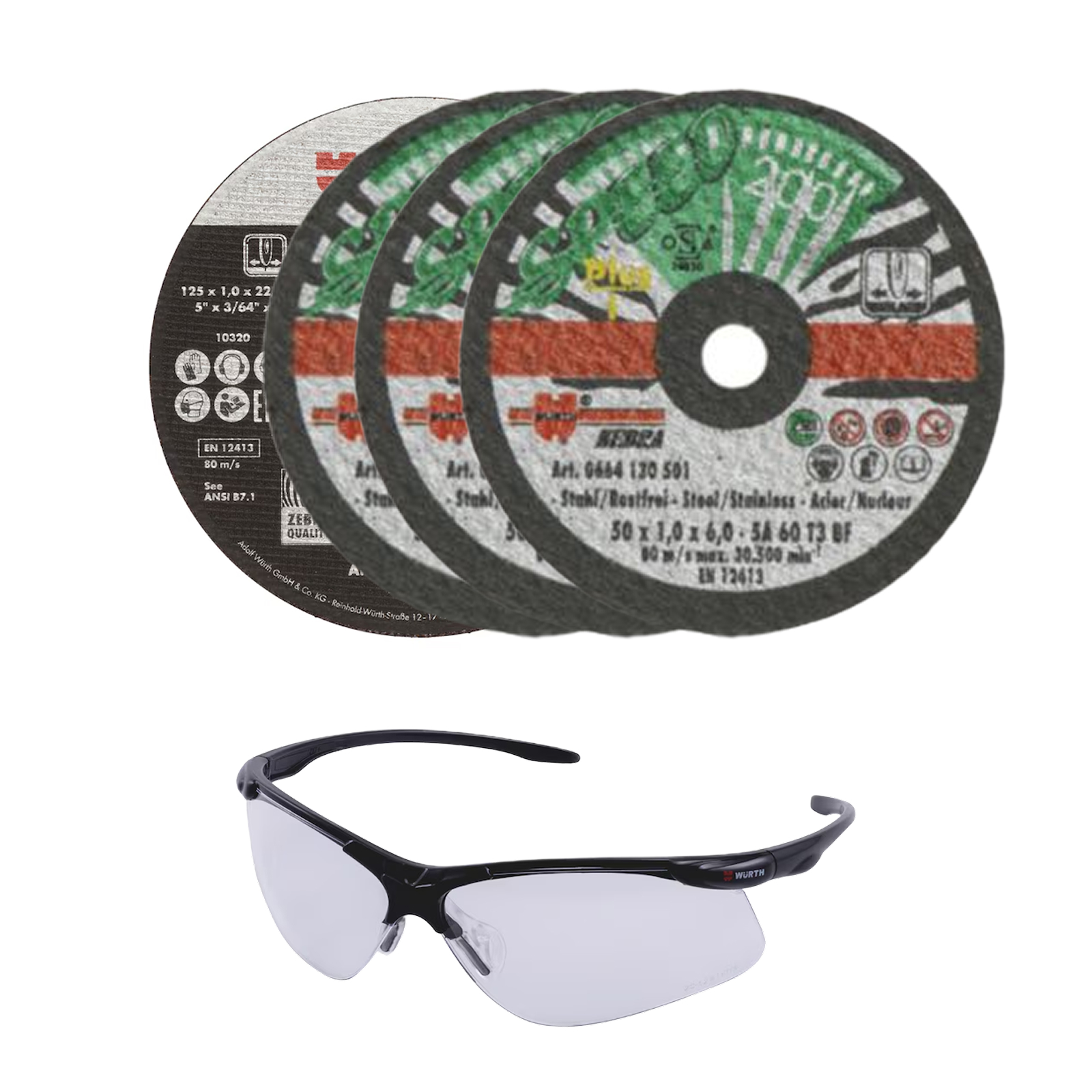 Rezalna plošča za inox (115/125/230) in prozorna zaščitna očala EN166 Askella za varno rezanje inoxa in zaščito oči.