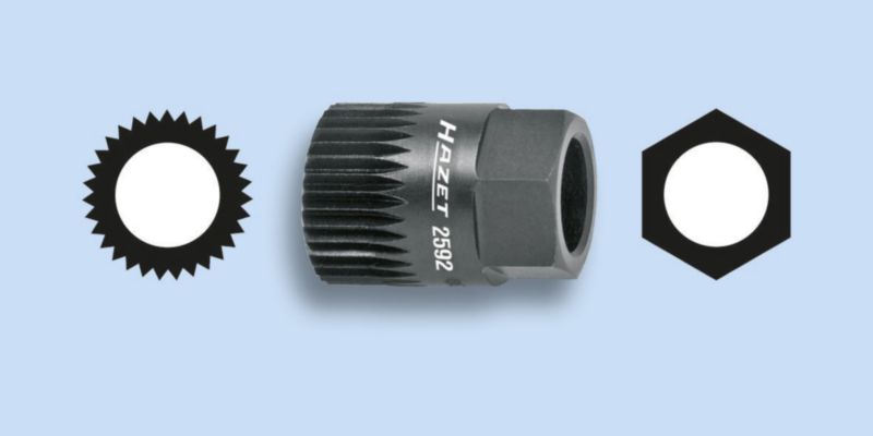 Nazobčan nastavek za namestitev ali odstranitev jermenic jermena z V-rebri na generatorjih.