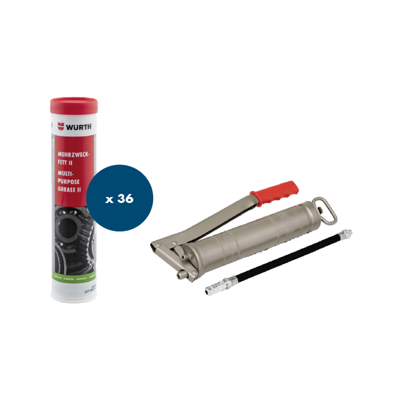 Set vsebuje grafitno mast za visoke pritiske in kovinsko mazalico za kartuše z zaščito pred korozijo in umazanijo.