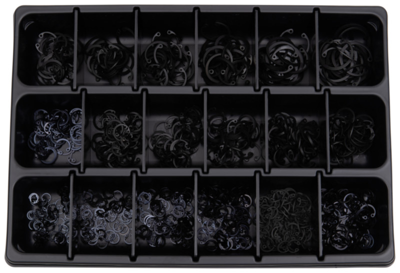 Varnostni obročki sortiman DIN 472 J, vzmetno jeklo, fosfatirano in oljeno, D 8 - 30mm. Brez kovčka za neposredno uporabo v obstoječih kovčkih, policah in vozilih v ORSY sistemu mere 4.4.1