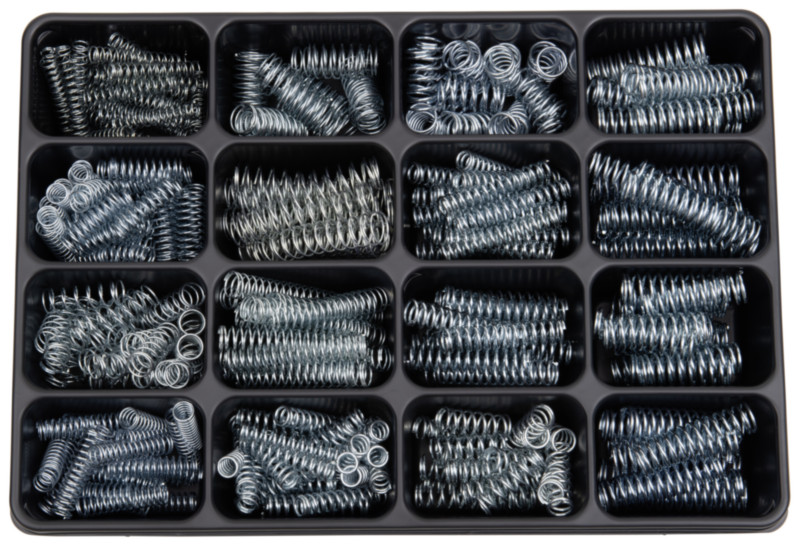 Tlačne vzmeti sortiman DIN 2095, vzmetno jeklo, pocinkano, modro pasivirano (A2K). Brez kovčka za neposredno uporabo v obstoječih kovčkih, policah in vozilih v ORSY sistemu mere 4.4.1