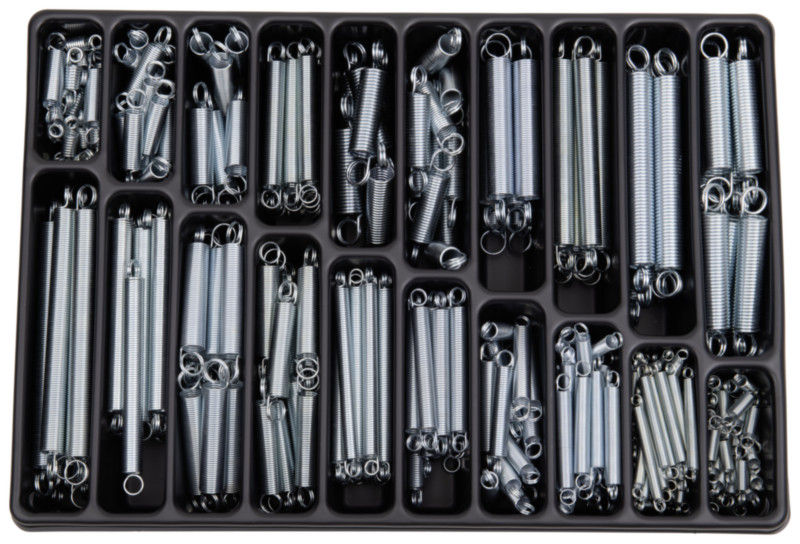 Natezne vzmeti z dvojnimi ušesi sortiman DIN 2097, vzmetno jeklo, pocinkano, modro pasivirano (A2K). Brez kovčka za neposredno uporabo v obstoječih kovčkih, policah in vozilih v ORSY sistemu mere 4.4.1