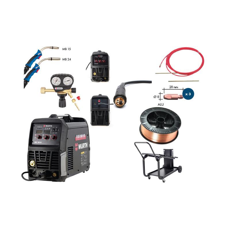 Set vključuje varilni aparat MIG/MAG 180S-5, primeren za varjenje aluminija z žico premera 0,6–1 mm, skupaj z manometrom, zaščitnimi gorilniki, kontaktno šobo, vozičkom in aluminijasto varilno žico, kar omogoča učinkovito varjenje aluminija.