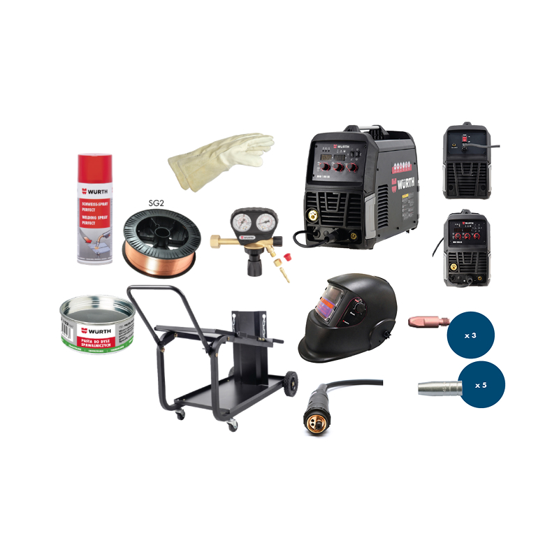 Set vključuje varilni aparat MIG/MAG 180S-5 za MIG, REO in LIFT-TIG varjenje, skupaj z manometrom, zaščitnimi rokavicami, plinsko dizo, masko za varjenje, varilno žico, pasto za varilne šobe in kontaktne šobe, kar omogoča učinkovito varjenje železa.