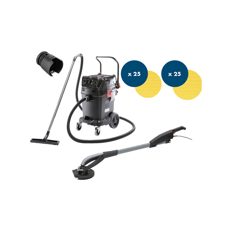 Set za brušenje stropov in sten vključuje ergonomski brusilnik z dolgo ročico, sesalec za prah ter brusni papir, vse za učinkovito odstranjevanje prahu pri delu z neravnimi površinami.