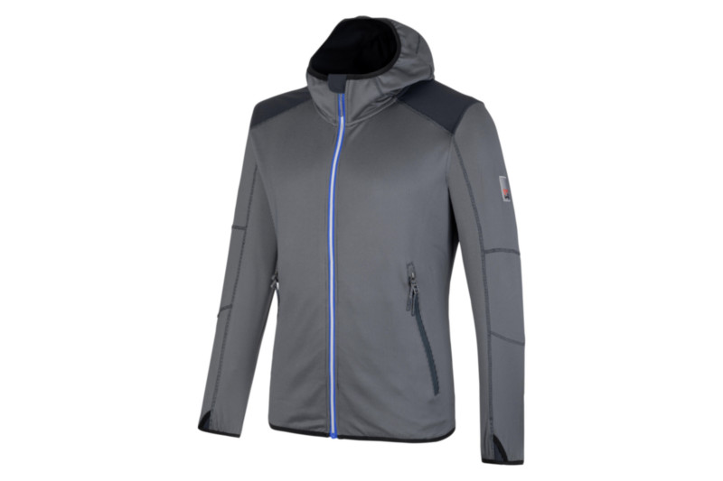 Raztegljiv flis iz tehnične tkanine, ki uravnava toploto, v športnem dizajnu z odsevnimi zadrgami v kontrastnih barvah.