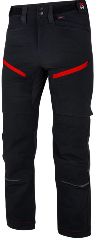 - • Dva sprednja žepa, dva zadnja žepa z zadrgo, dva stegenska žepa z zadrgo, žep za mobilni telefon in držalo za osebno izkaznico, žep za ravnilo