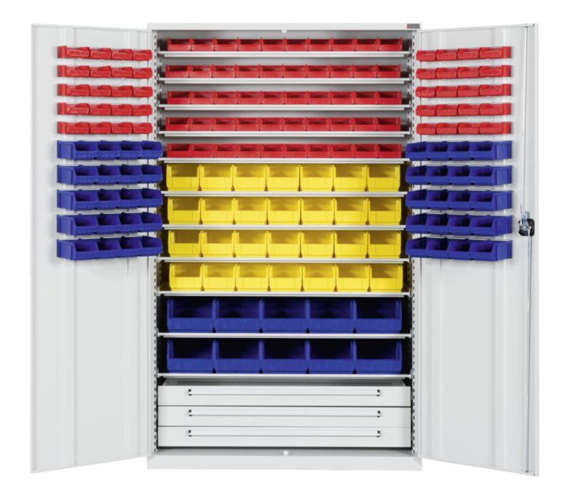 Visokokakovostna omara za škatle za shranjevanje za optimalno shranjevanje plastičnih škatel za shranjevanje, z dodatnimi policami in predali.