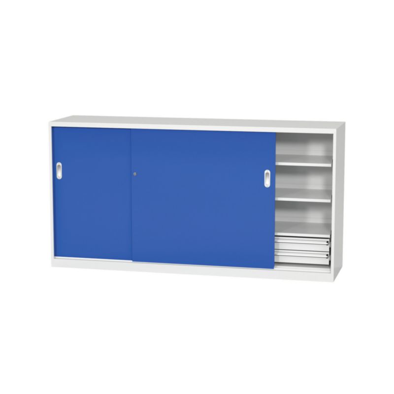 Robustna omara z drsnimi vrati z izbirnimi nastavljivimi predali in policami.