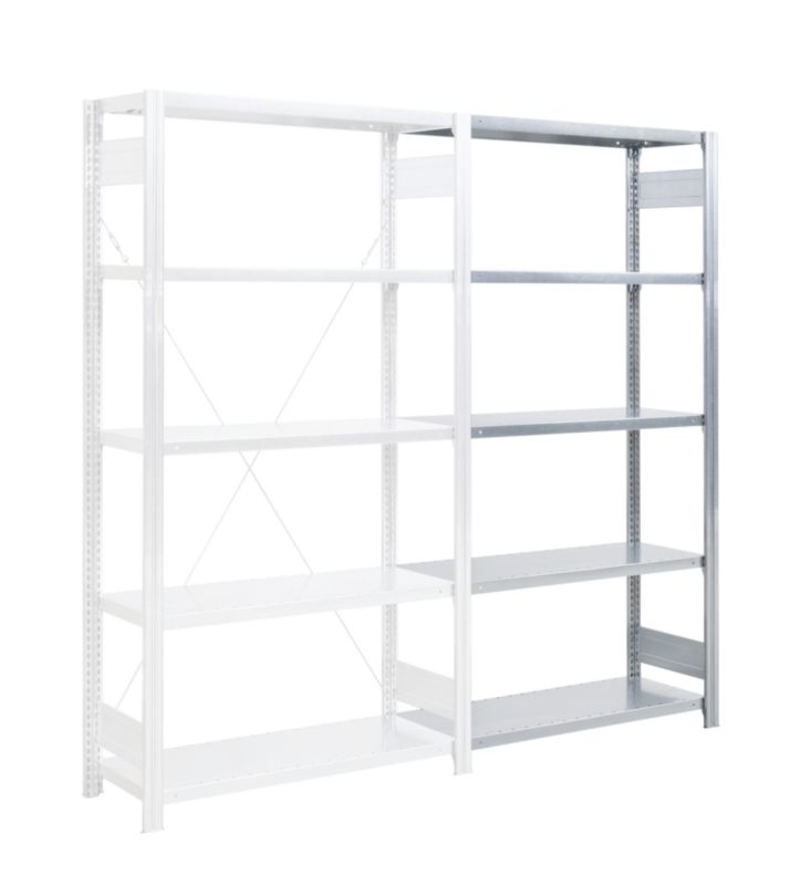 Robusten vtični regal s 5 jeklenimi policami za srednje težke tovore v skladiščih, delavnicah in tovarnah.