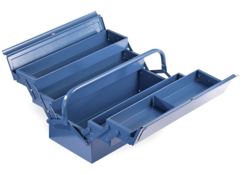 Zložljiva škatla za orodje z robustnimi zakovičenimi tečaji.