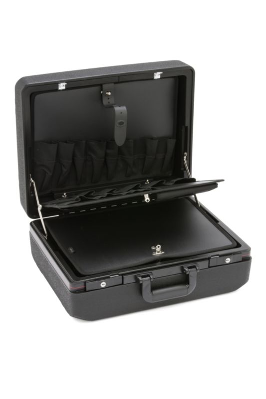 Robusten in proti udarcem odporen servisni kovček z dvema odstranljivima pladnjema za orodje in žepi za orodje.