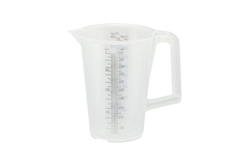 Na vsaki strani merilnega vrča je vtisnjena in črno natisnjena lestvica: