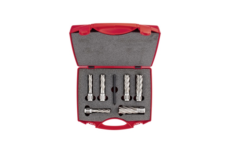 • V nasprotju s spiralnimi svedri, kronski sveder ne obdela celotnega premera izvrtine, ampak samo tanek obroč materiala. Izvlecite vrtalno jedro z izmetalnim zatičem z vzmetno močjo, ki ni v obsegu dobave. Krožni svedri so torej do 10-krat hitrejši glede časa vrtanja v primerjavi s spiralnimi svedri.