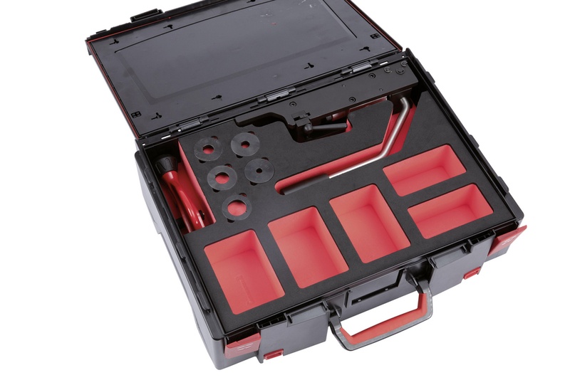 - Vsebina: 1 stiskalno orodje, 5 nastavkov (polovične školjke) DN8 - DN25, 1 rezalnik cevi vklj. rezervno kolo, 1 sistemski kovček 8.4.2 z vložkom iz trde pene.