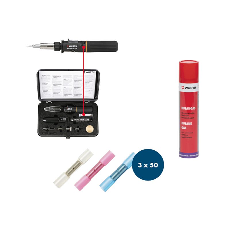 Akcijski set za cinjenje omogoča učinkovito spajkanje in ustvarjanje trdnih električnih spojev, vključno z izoliranimi veznimi tulci in prenosnim plinskim spajkalnikom.