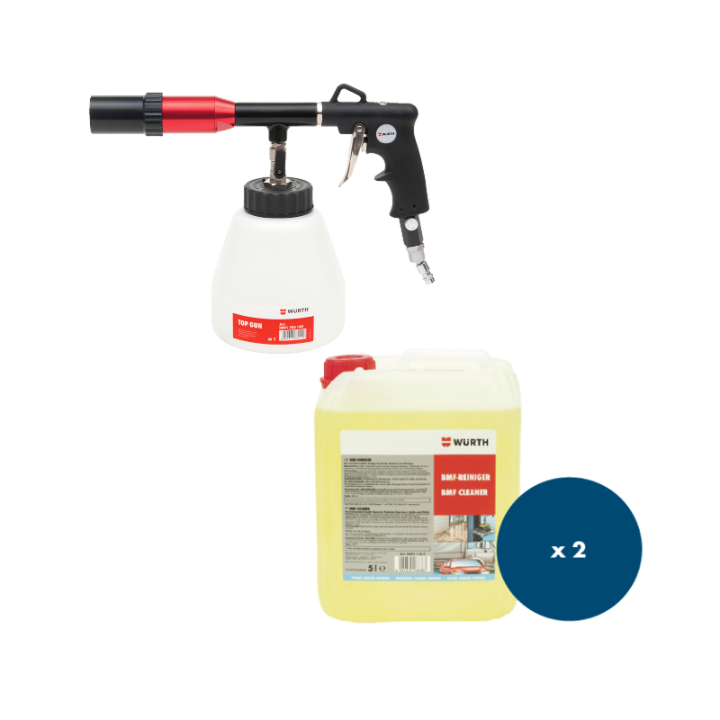 Set za profesionalno čiščenje in zaščito površin, ki vključuje pištolo in čistilo za naprave, stroje in vozila, ki ne poškoduje lakov, gume ali plastike.