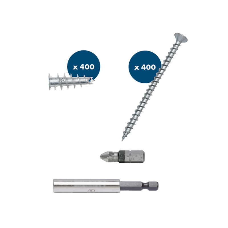 Set vključuje vložke Shark Pro za zanesljivo sidranje v različnih podlagah, primerne za enostavno in močno pritrditev z lesnimi vijaki WUPO, ter sveder Quadro L-vario za natančno vrtanje odprtin ustreznih globin in debelin.