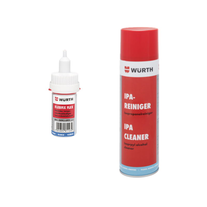 Set za močno in prožno lepljenje, ki vključuje sekundno lepilo in večnamensko izopropilno alkoholno čistilo za pripravo in čiščenje površin pred lepljenjem.