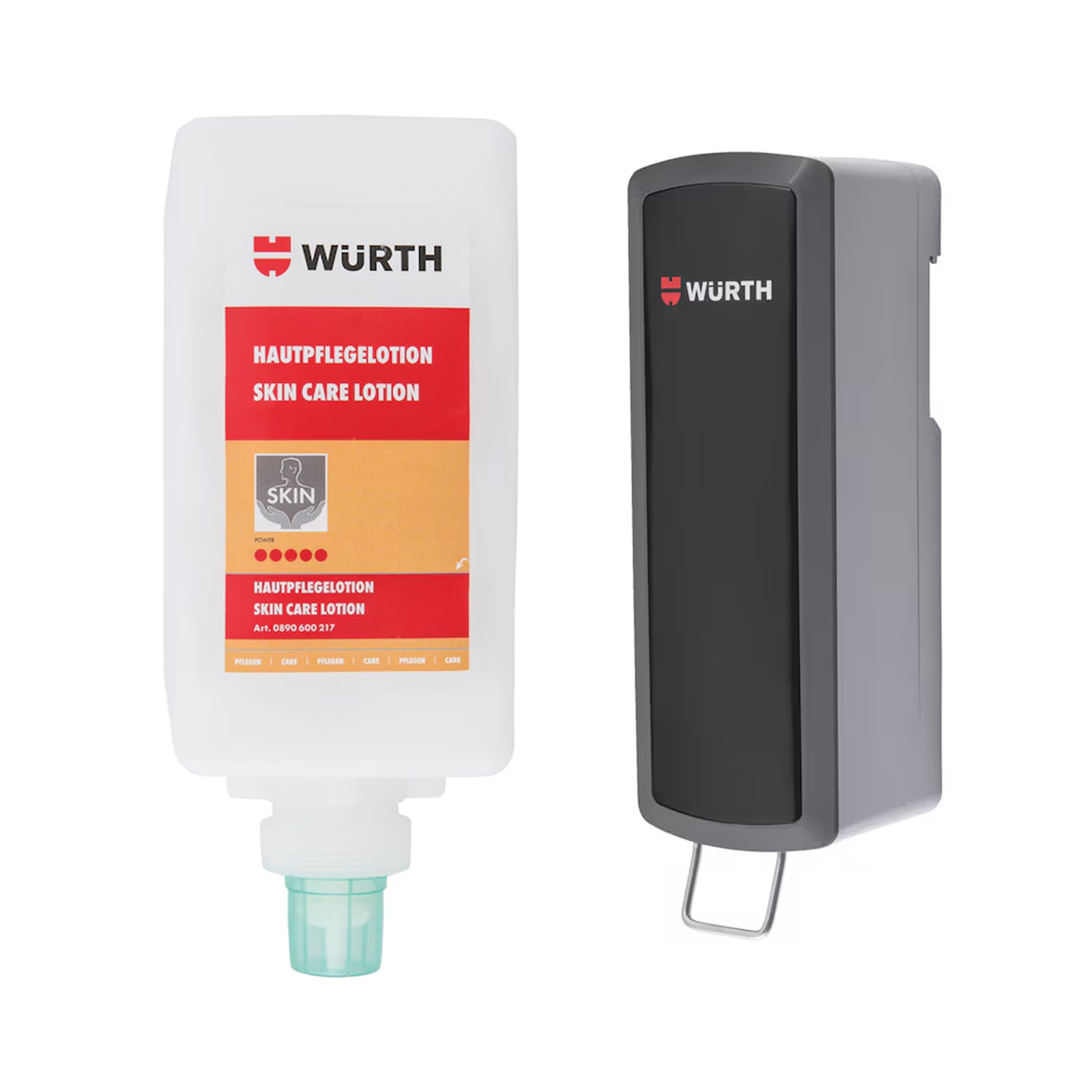 Dozator s pritisno ročico za doziranje izdelkov za zaščito kože, čiščenje in nego v delavnici ali umivalnici. Na voljo tudi v beli barvi.