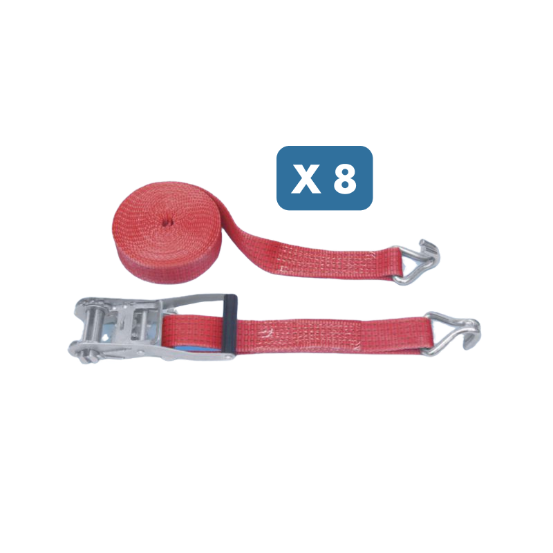 Povezovalni dvodelni trak z ragljo, širina 50 mm in dolžina 8 m, za varno pritrjevanje tovora. Na voljo posamično ali v pakiranju po 8 kosov.