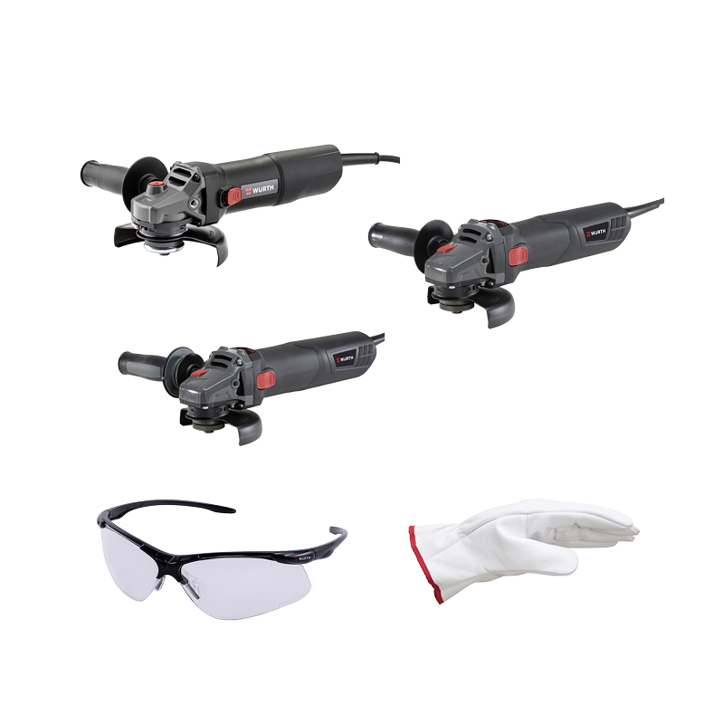 Set vsebuje kotno rezilko za različna rezanja in zaščitna očala ter usnjene rokavice.