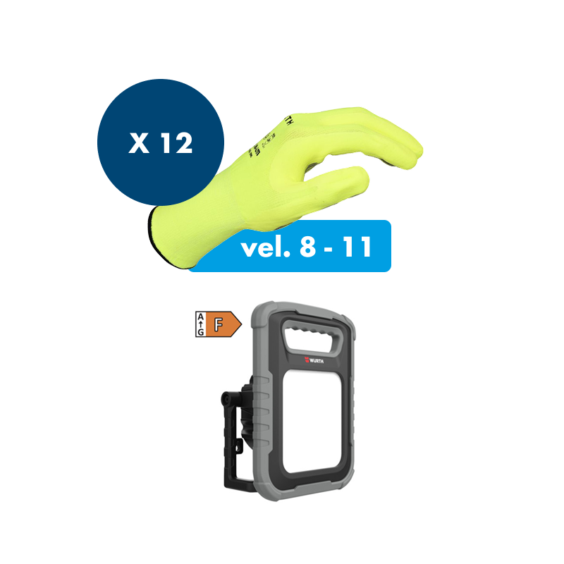 Set LED delovne luči in 12 kosov visoko vidljivih zaščitnih rokavic TigerFlex, ki so odlične za področja s slabšo vidljivostjo.