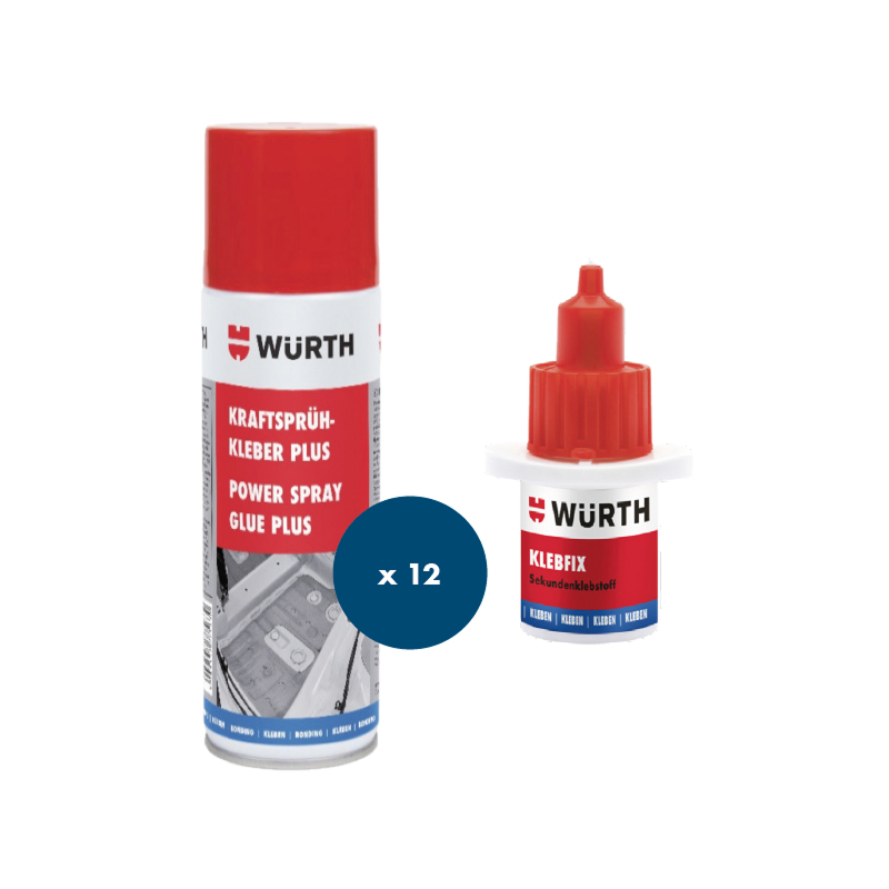 Set za hitro in močno lepljenje, ki vključuje transparentno kontaktno lepilo v spreju z visoko lepilno močjo ter sekundno lepilo z dozirnim sistemom za natančno lepljenje kovine, plastike in gume.