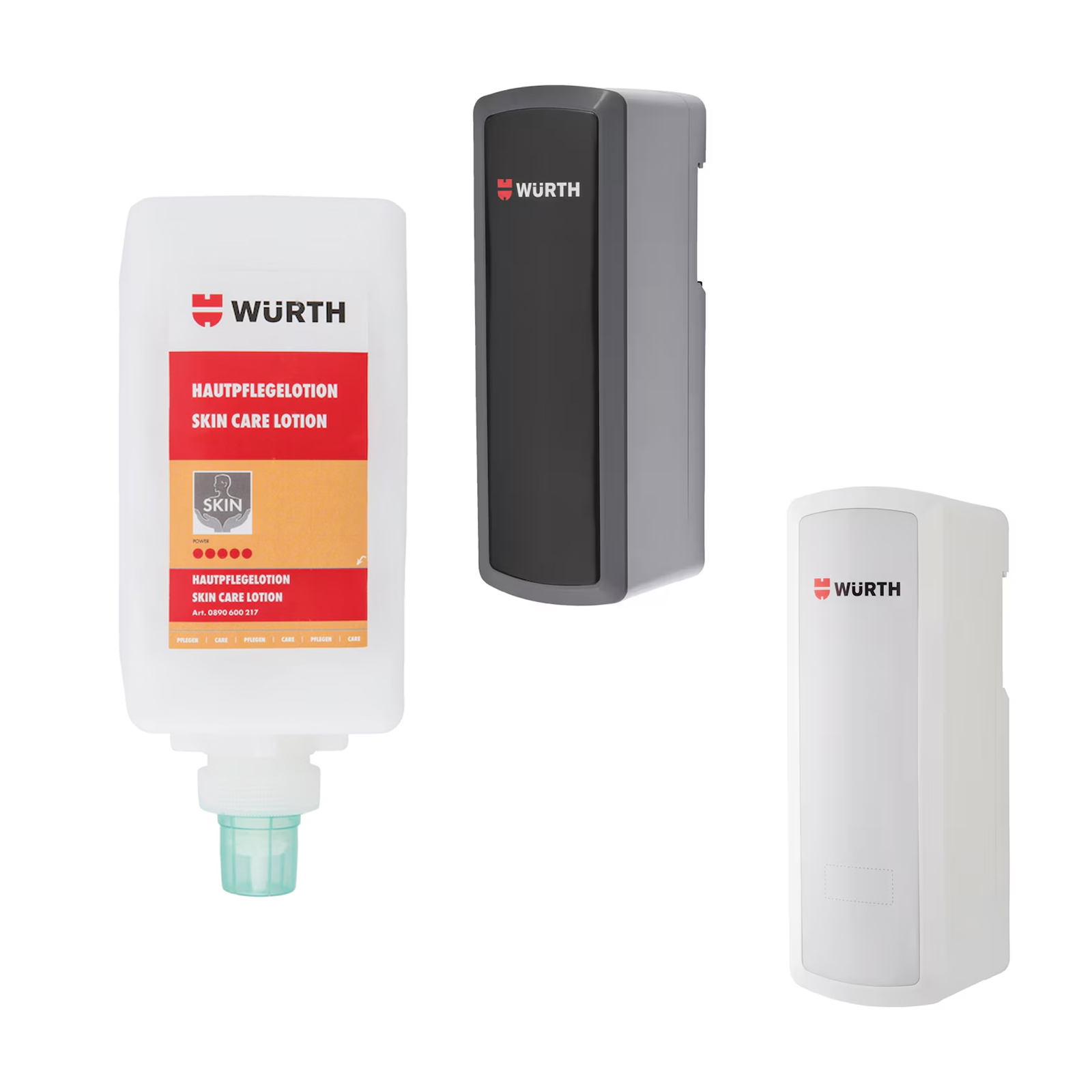 Brezkontaktni dozirnik Skin Line (črn ali bel) in negovalni losjon 1000 ml omogočata natančno doziranje brez dotika in manjšo porabo losjona za nego po delu.