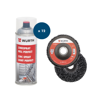 Set za zaščito in obnovo površin, ki vključuje cink sprej za dolgotrajno zaščito pred korozijo, ter visokokakovostno brusno ploščo za učinkovito brušenje kovinskih, lesenih in plastičnih površin.