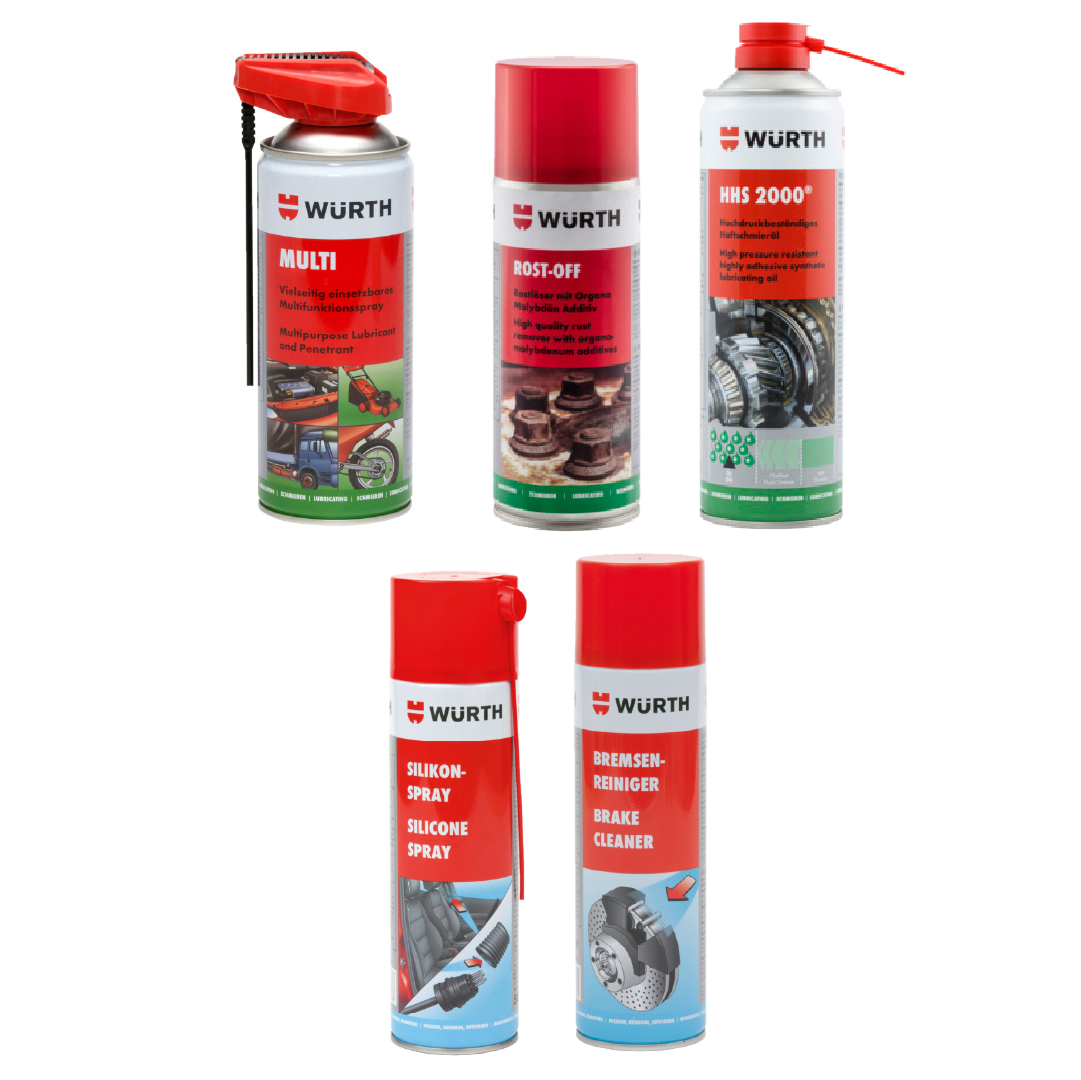 Set vključuje maziva in čistila za podmazovanje, zaščito pred korozijo, odstranjevanje rje ter nego materialov v zahtevnih pogojih.