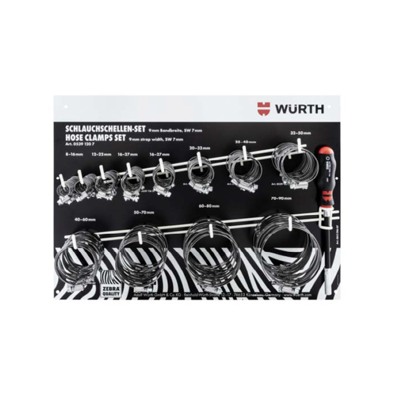 121-delni set vsebuje cevne objemke 8 do 90 mm na displeju z izvijačem za pritrjevanje objemk.