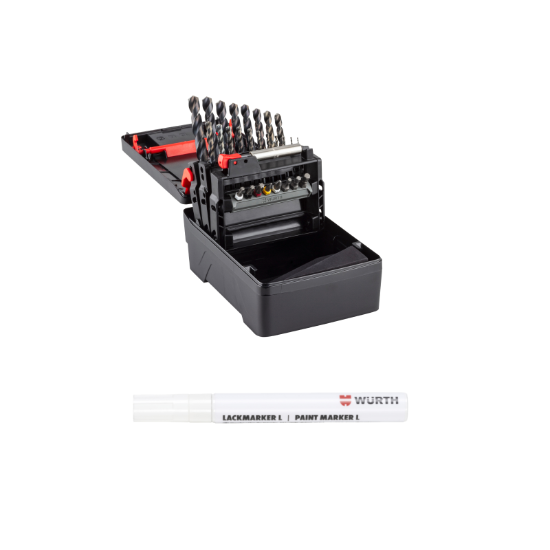 3-v-1 set z vijačnimi svedri HSS DIN 338 RN 130°, nastavki in nosilcem nastavkov, 28 delov