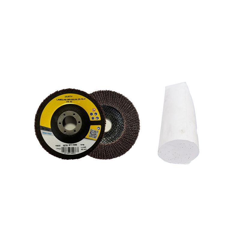 Polirna lamelna plošča premera 115mm ter luknjo za vpenjanje 22,23 z grobo polirno pasto uporabo s kotno brusilko z nastavljivimi obrati. Priporočena hitrost do 5.000 o./min.