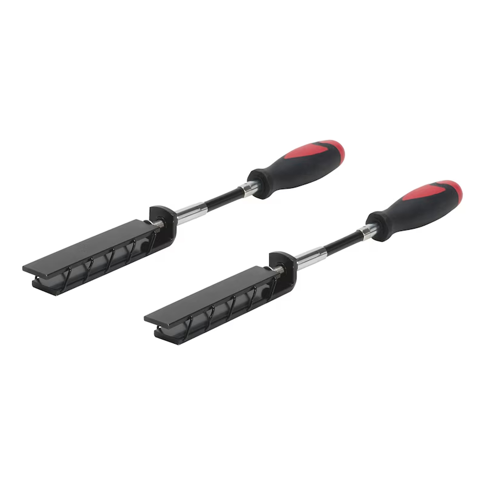 Set za hitro in enostavno montažo oken in vrat. Z vrtenjem ročaja se kovinski plošči natančno pritisneta druga ob drugo, kar omogoča stabilno nastavitev in pritrditev med vgradnjo.