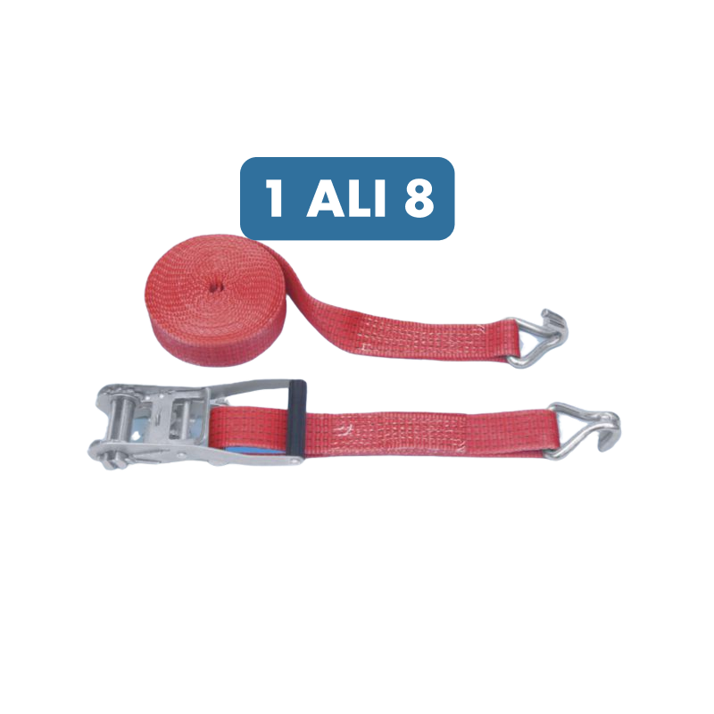 Povezovalni dvodelni trak z ragljo, širina 50 mm in dolžina 8 m, za varno pritrjevanje tovora. Na voljo posamično ali v pakiranju po 8 kosov.