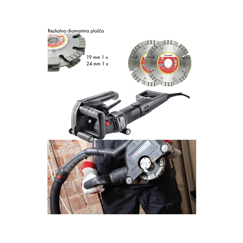 Set je zasnovan za rezanje inštalacijskih kanalov v zidovih z uporabo rezkarja in rezalnih plošč.
