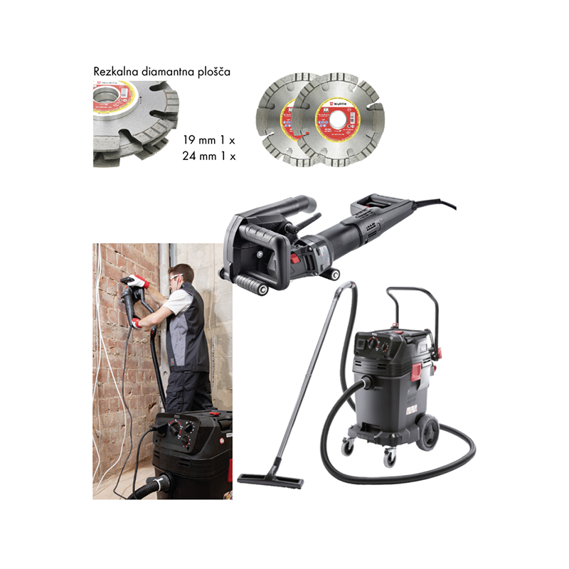 Set za rezanje in obdelavo inštalacijskih kanalov v zidovih z uporabo rezkarja in rezalnih plošč, ob tem pa omogoča tudi sesanje prahu s šriloženim sesalcem za čistejše delo.