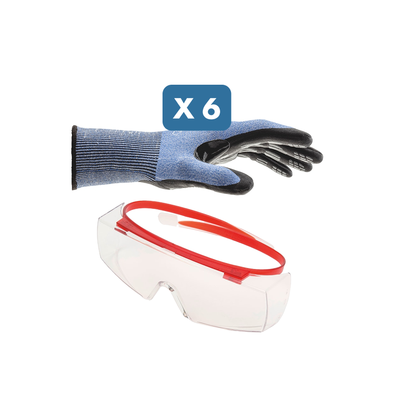 Set vključuje 6 parov protireznih rokavic razreda F ter zaščitna očala Libra s pokritimi stranicami in je primeren za delo z ostrimi materiali ter zanesljivo zaščito rok in oči.
